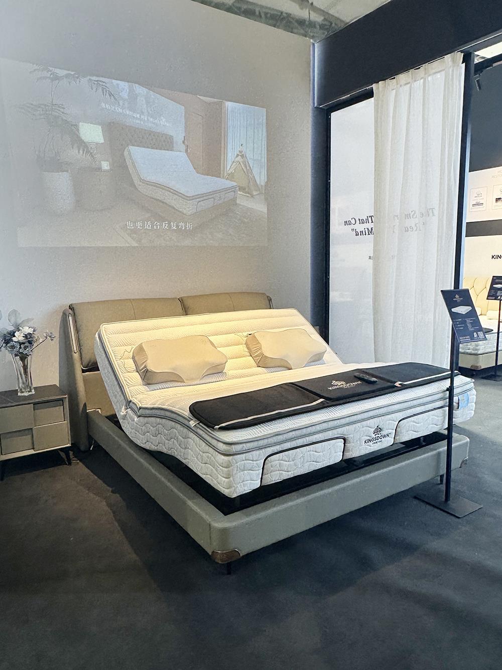 不止于科技赋能,更在美学深耕。展会现场,金斯当三款春季新品皮床惊艳亮相,每一款,都自成一派风韵: